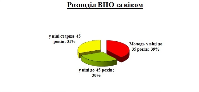 Вікова структура безробітних з числа ВПО є наступною: частка молоді у віці до 35 років серед переселенців становить 39%, питома вага осіб віком до 45 років – 30%, старше 45 років