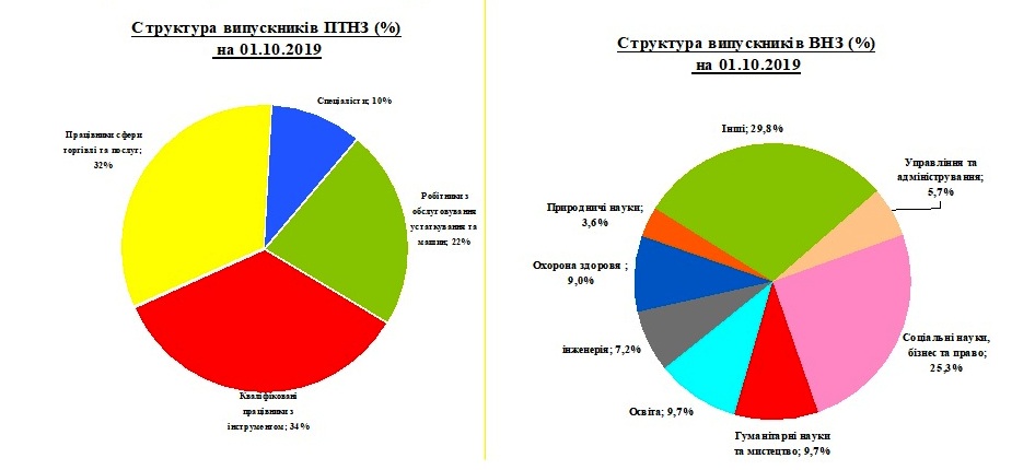 Серед випускників ПТНЗ 32% становлять працівники сфери торгівлі та послуг, 22% робітники з обслуговування устаткування та машин, 34% - кваліфіковані робітники з інструментом, 10% – спеціалісти.