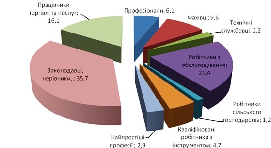 За розділами класифікацій професій: 21,4% працевлаштувалися на місця робітників з обслуговування, експлуатації, складання устаткування та машин; 35,7% - на місця, керівників, менеджерів та військовослужбовців, 16,1% - на місця працівників сфери торгівлі та послуг, 9,6% на місця фахівців, 4,7% на місця кваліфікованих робітників з інструментом.