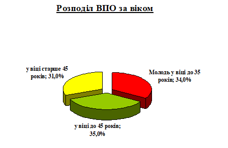 Вікова структура безробітних з числа ВПО є наступною: частка молоді у віці до 35 років серед переселенців становить 34%, питома вага осіб віком до 45 років – 35%, старше 45 років – 31%.