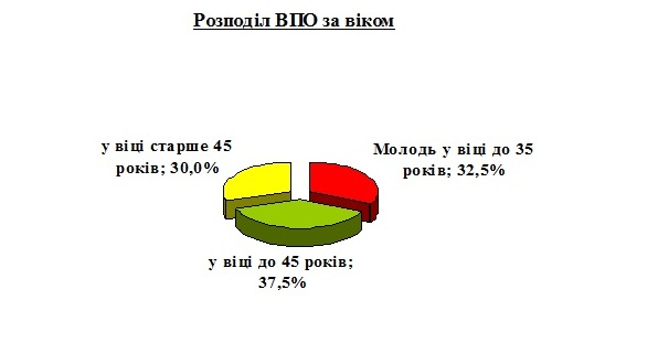 Розподіл ВПО за освітою є наступним: особи з вищою освітою становлять 53,8%, з професійно-технічною – 26,2%, з початковою та середньою – 20%. Характерним є те, що частка переселенців з вищою освітою є переважаючою у більшості районів.