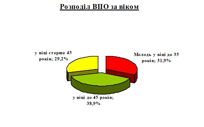 Вікова структура безробітних з числа ВПО є наступною: частка молоді у віці до 35 років серед переселенців становить 31,9%, питома вага осіб віком до 45 років – 38,9%, старше 45 років – 29,2%.