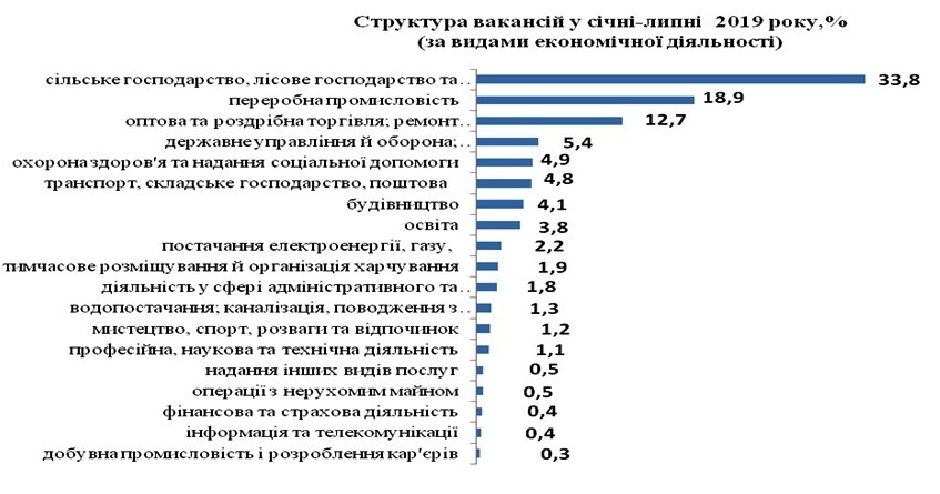 За видами економічної діяльності: 33,8% вакансій пропонується у сільському господарстві, 18,9% на підприємствах та установах переробної промисловості, 12,7% - в оптовій та роздрібній торгівлі.