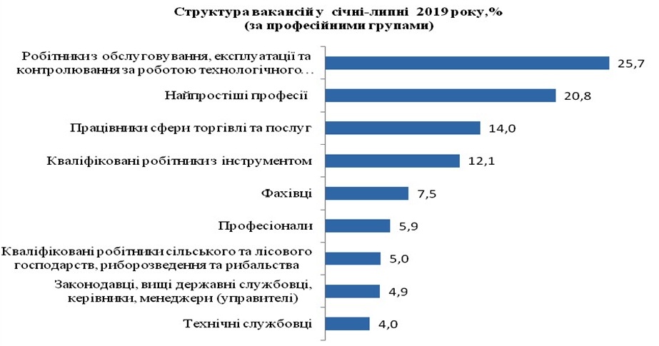 За професійними групами: найбільший попит роботодавців спостерігається на робітників з обслуговування, експлуатації та контролювання за роботою технологічного устаткування та машин, на представників найпростіших професій, на працівників сфери торгівлі та послуг.