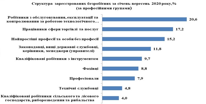 За професійними групами серед зареєстрованих безробітних переважають робітники з обслуговування, експлуатації та устаткування машин, працівники галузей торгівлі та послуг, працівники найпростіших професій.