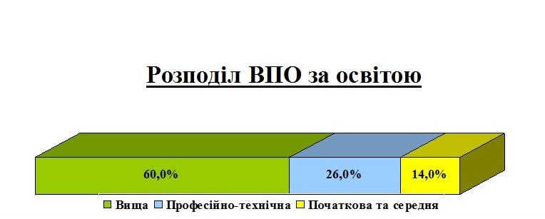 Розподіл ВПО за освітою є наступним: особи з вищою освітою становлять 60%, з професійно-технічною – 26%, з початковою та середньою – 14%. Характерним є те, що частка переселенців з вищою освітою є переважаючою у більшості районів.