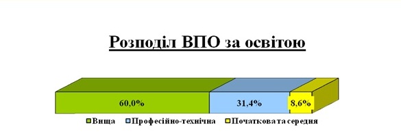 Розподіл ВПО за освітою є наступним: особи з вищою освітою становлять 60%, з професійно-технічною – 31,4%, з початковою та середньою – 8,6%. Характерним є те, що частка переселенців з вищою освітою є переважаючою у більшості районів.