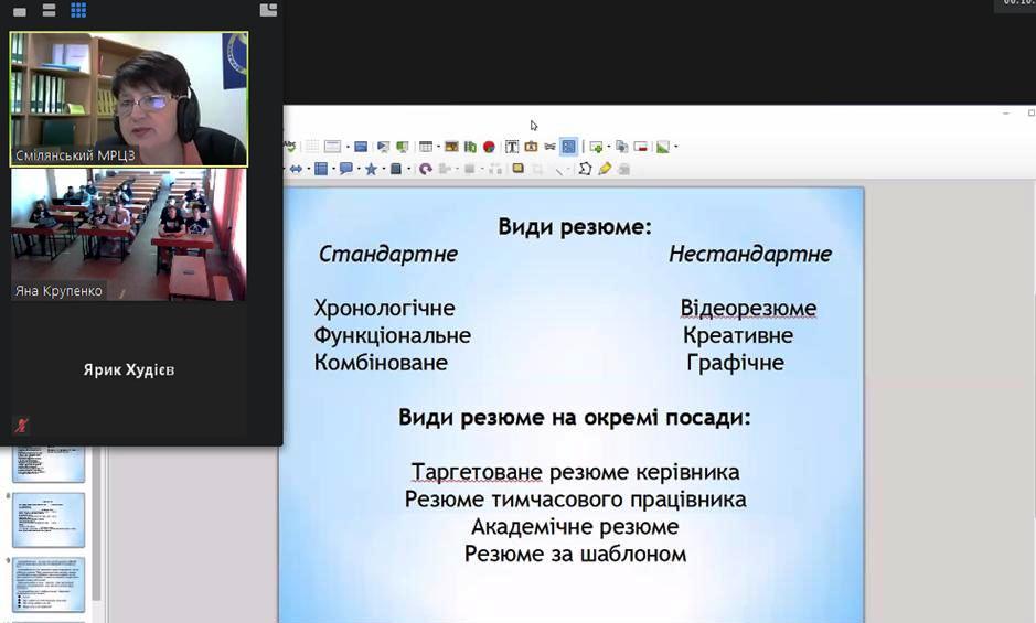 Так, нещодавно фахівчиня з профорієнтації провела онлайн заняття на тему «Експрес-підготовка резюме» для студентів шести груп 4-го курсу Відокремленого структурного підрозділу «Смілянського технологічного фахового коледжу НУХТ».