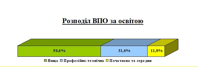 Розподіл ВПО за освітою є наступним: особи з вищою освітою становлять 56,6%, з професійно-технічною – 31,6%, з початковою та середньою – 11,8%. Характерним є те, що частка переселенців з вищою освітою є переважаючою у більшості районів.