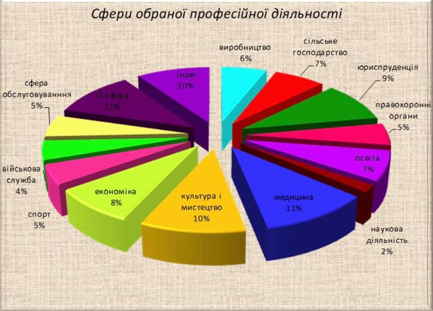 Вибірку цього соціологічного дослідження, проведеного протягом жовтня-грудня 2020 року в закладах загальної середньої освіти, становили 3420 респондентів. Як показали результати, в опитуванні взяли участь майже в однаковому співвідношенні дівчата та хлопці, що свідчить про репрезентативність вибірки. Під час опитування у більшості учнів 11-х класів виявлена готовність до вибору професії, оскільки майже 90% із них вже мають сформовані плани і визначилися із типом навчального закладу, в якому планують здобувати подальшу освіту. Про те, що більшість учнів 11-х класів орієнтовані на свідомий вибір майбутньої професії, свідчить і те, що майже всі респонденти визначилися з власними професійними схильностями та вирішили, в якій сфері діяльності хочуть реалізувати себе в майбутньому. Рейтинг сфер професійної діяльності виглядає наступним чином: