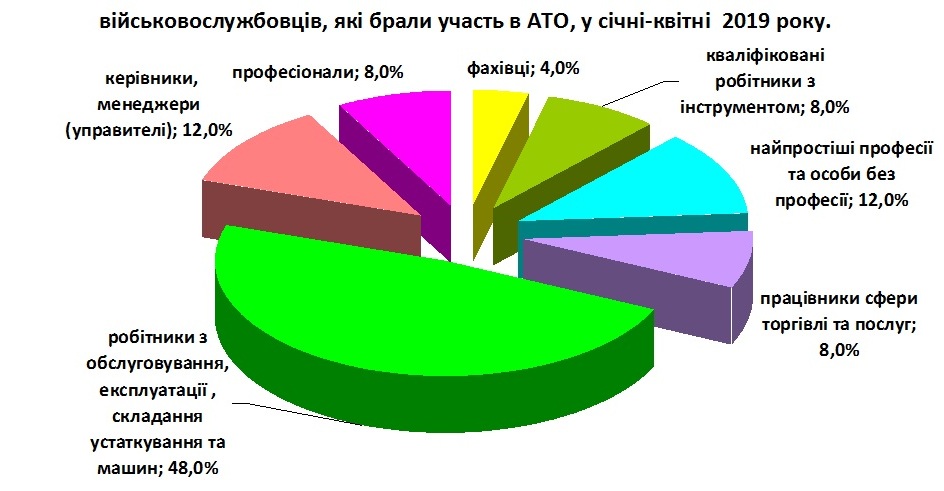 З початку 2019 року послугами обласної служби зайнятості скористалися 691 безробітний з числа військовослужбовців, які брали участь в антитерористичній операції та операції об’єднаних сил, з них 83 особи з інвалідністю. Допомогу по безробіттю отримували 638 учасників АТО (ООС).