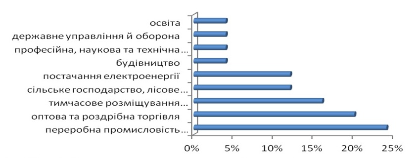 За видами економічної діяльності: 24% безробітних працевлаштовані у переробній промисловості, 20% в оптовій та роздрібній торгівлі та ремонті автотранспортних засобів, 16% в тимчасовому розміщенні та організації харчування.